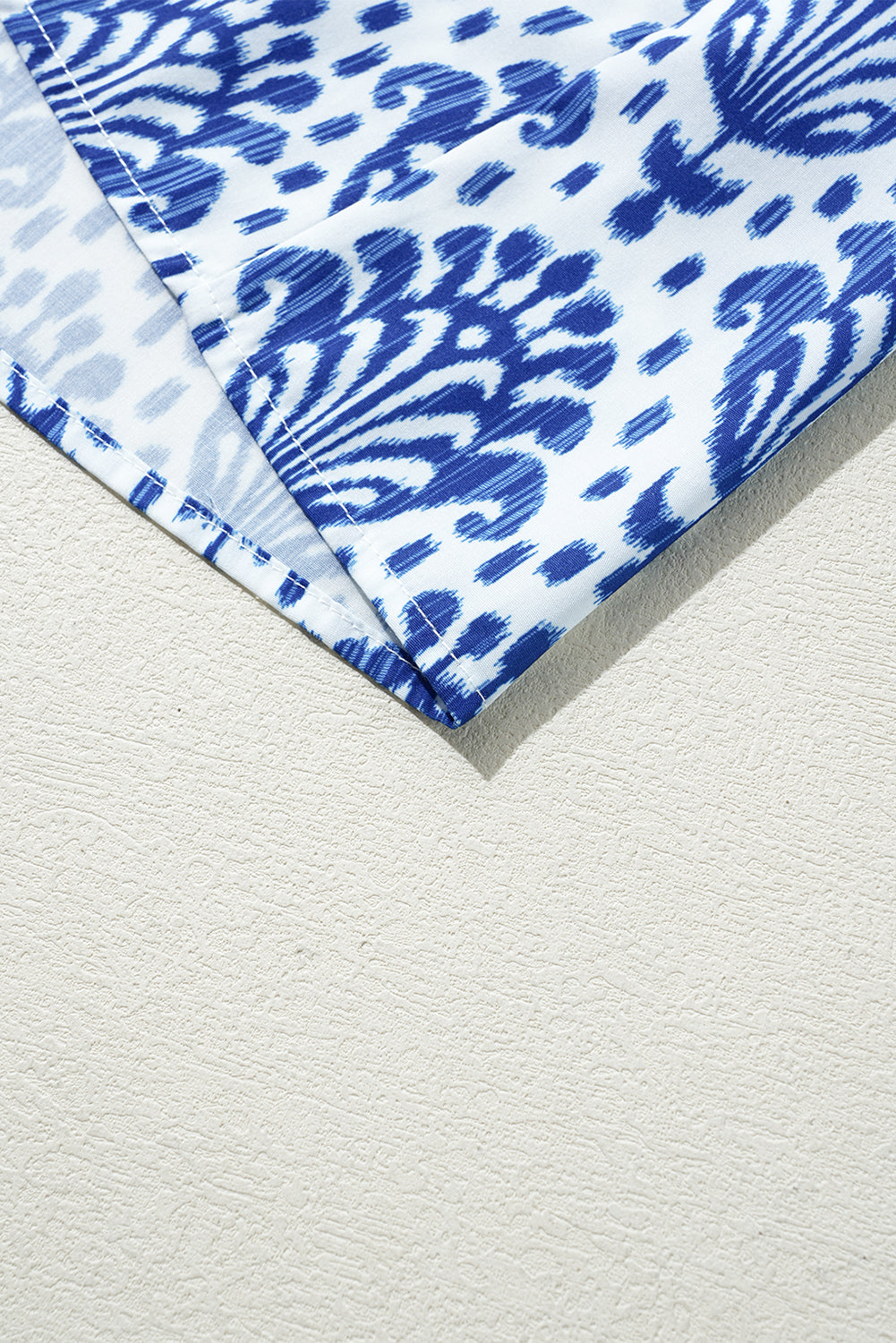 Blue Western Fashion Print Floral Puff Sleeve Frilled Neck Blouse
