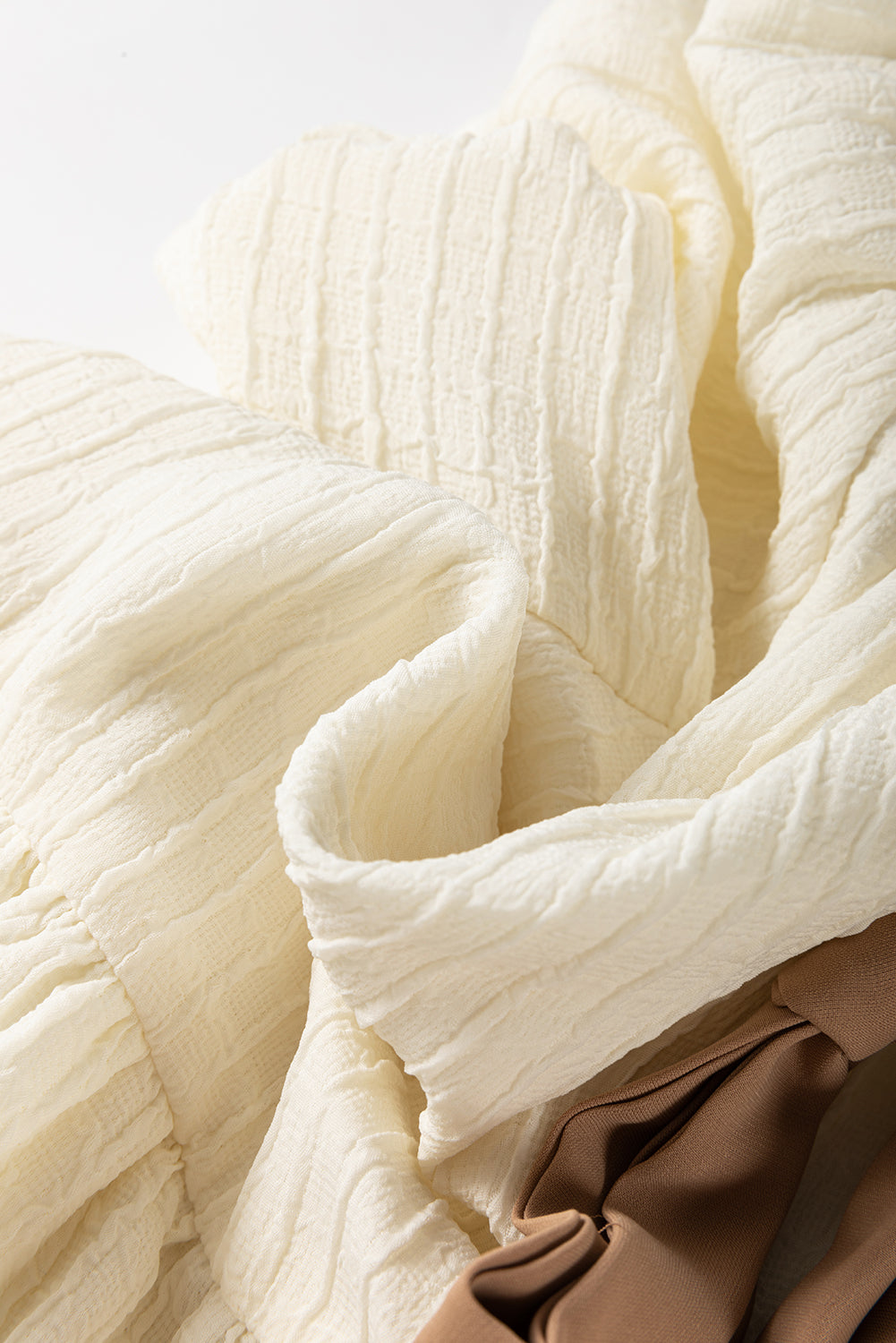 White Textured Bow Ties Front Bubble Hem Puff Short Sleeve Blouse